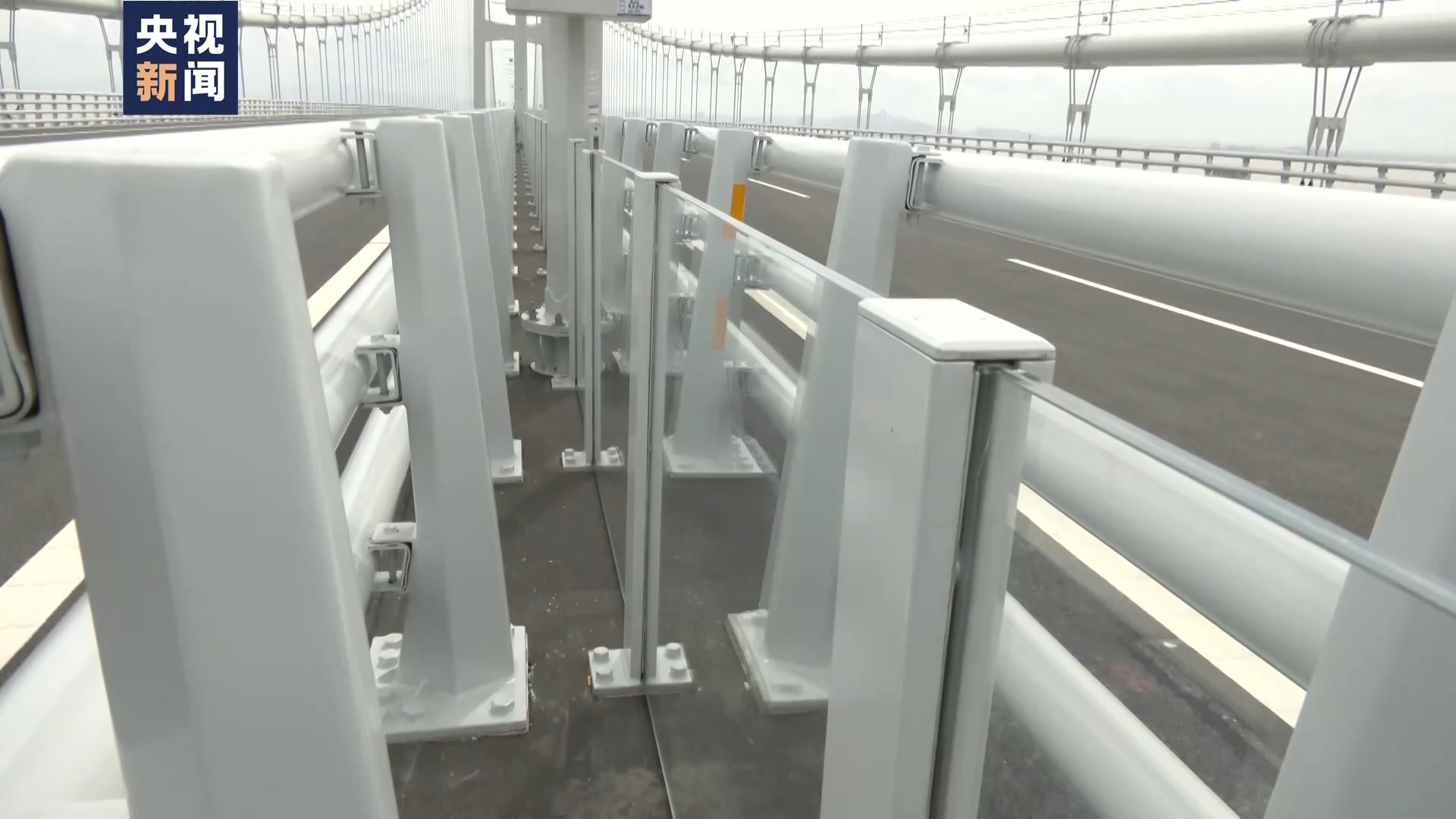 總臺央視記者曹丹說,在深中大橋的橋面中心位置,隱藏著一道玻璃墻。看上去就是一塊塊普通的鋼化玻璃,但是它們卻是深中大橋抗風的“秘密武器”。