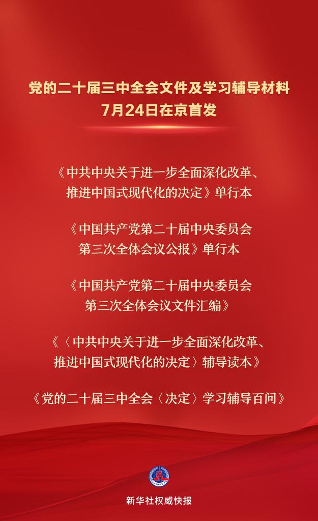 黨的二十屆三中全會文件及學習輔導材料7月24日在京首發