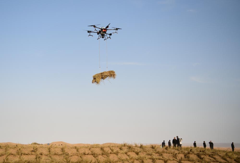 在阿拉善左旗“三北”六期工程蒙甘邊境防沙治沙沙漠鎖邊項目現(xiàn)場,200多名治沙工人俯身沙海,將一株株花棒苗植入沙土中。“我們運用無人機苗木調(diào)運技術(shù),以智能化手段替代人力,大幅提升種植效率與精準(zhǔn)度,為造林工作注入科技動能。”內(nèi)蒙古阿拉善左旗藍馬園林生態(tài)建設(shè)有限責(zé)任公司副總經(jīng)理劉海軍說。
